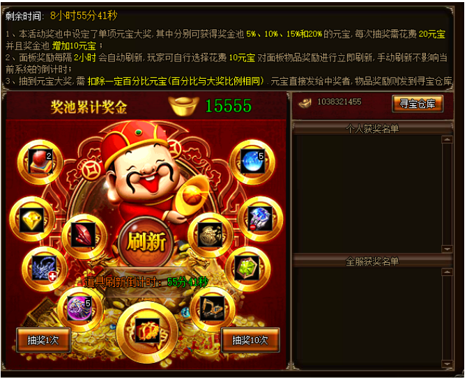 d) 抽奖获得的物品道具直接发放到玩家的寻宝仓库,元宝大奖直接发放给中奖者