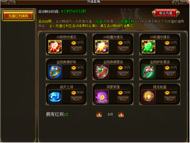 活动详情:活动期间,玩家每充值一元宝可获得一个充值红利,红利可用于购买活动中的丰富道具商品。注意:充值红利在活动结束后清零,请在活动期间内消费完哦。