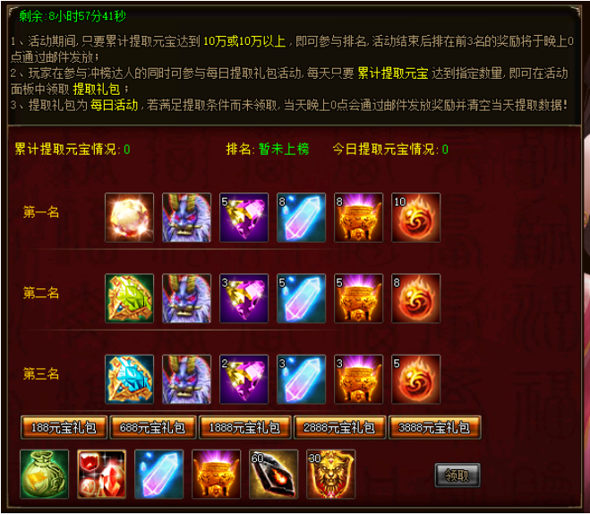 b) 活动期间,玩家每天累计提取元宝达到188、688、1888、2888、3888时即可在面板领取相应的每日充值礼包,礼包每日重置,当天没有领取的奖励第二天零点时以邮件补发。