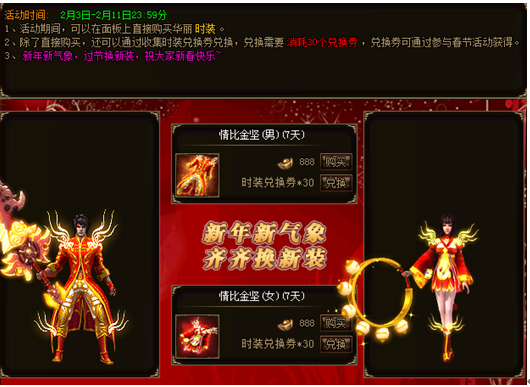 活动期间,玩家可在面板直接购买春节情比金坚时装,直接购买的时装不绑定,同时也可以在面板消耗30个时装兑换符兑换,兑换的时装绑定的。