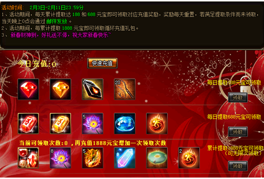 活动期间,每天累计提取188和688元宝即可领取对应的每日充值奖励,礼包每天重置,若满足条件而未领取零点会通过邮件补发。玩家每累计提取1888元宝即可领取循环充值奖励,循环充值奖励活动结束时未领取的话以邮件补发。