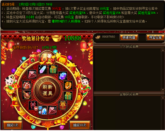 活动期间,玩家可以通过面板抽奖按钮进行抽奖,每次抽奖需花费30元宝,每抽1次累计奖金池就增加10元宝,抽中物品奖励直接发放到寻宝仓库中,奖池中设定了3项元宝大奖,分别是惊喜大奖、豪华大奖和至尊大奖,抽中后获得奖池累积的百分比元宝奖励,抽到元宝大奖所得的元宝,需扣除5%的个人所得税,扣除后所剩元宝直接发放给中奖者,比如抽中了5%的元宝大奖,那实际获得的是奖池累积奖金*5%*(1-5%)的元宝。面板奖励每隔1小时自动刷新,可点击面板中间的刷新道具按钮花费10元宝对面板物品奖励进行刷新