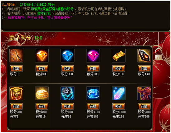活动期间,玩家每消费1元宝即获得1点春节积分,同时使用猴年红包也可获得春节积分还有经验礼券奖励,猴年红包通过春节活动获得,春节积分可在活动面板兑换丰富奖励。