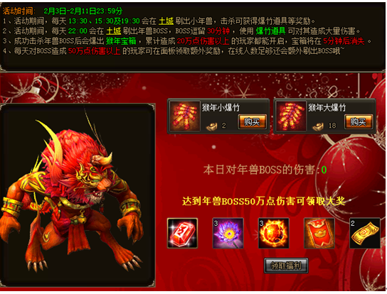 c) 活动期间,每天对年兽BOSS造成 50万点伤害以上的玩家可在面板领取额外奖励。