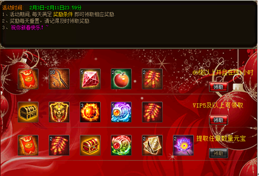 活动开启后,玩家每天完成相应的奖励目标即可领取相应奖励,条件分别为:60级以上每天登陆一小时、VIP等级达到5级以上、每日充值至少1元宝。奖励每日重置,当天满足条件不领取不会补发,玩家需及时领取。