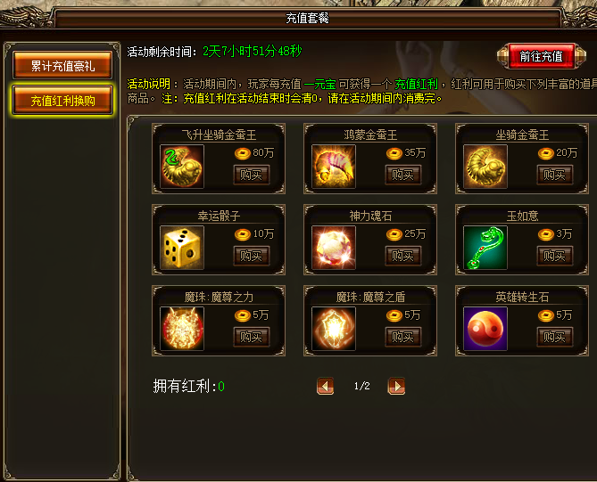 活动详情:活动期间,玩家每充值一元宝可获得一个充值红利,红利可用于购买活动中的丰富道具商品。注意:充值红利在活动结束后清零,请在活动期间内消费完哦。