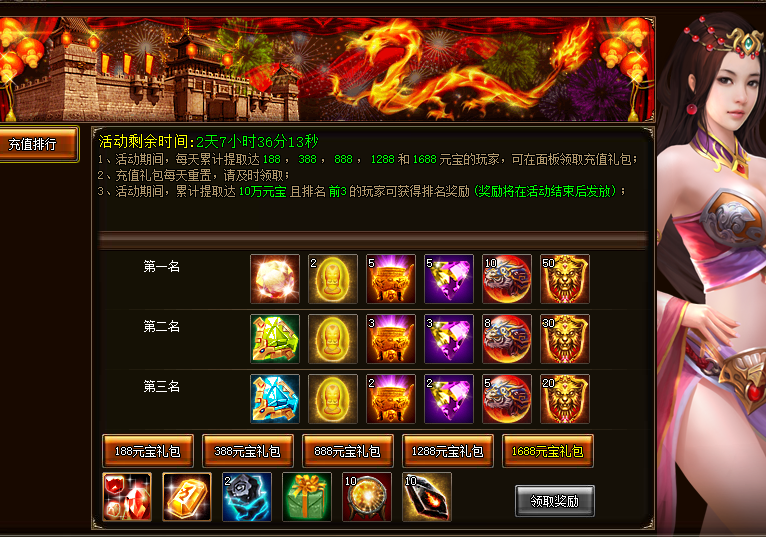 活动期间,累计提取达10万元宝且排名前3的玩家可获得排名奖励(奖励在活动结束后发放)
