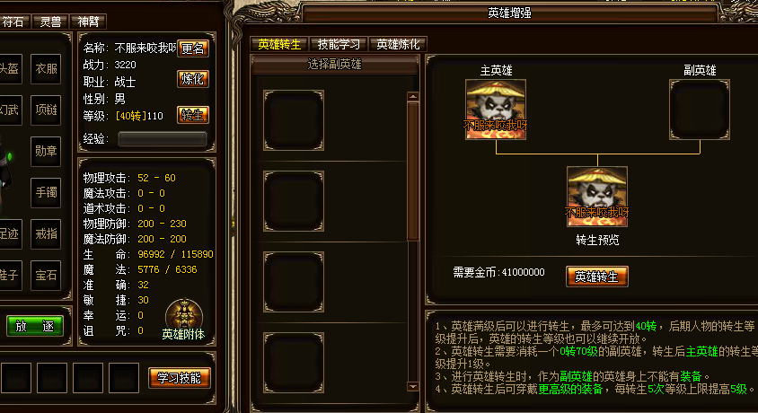 英雄转生上限提升至40转,同时英雄等级上限提升至110,满级英雄可通过英雄转生面板消耗金币级1个0转70级英雄转生。