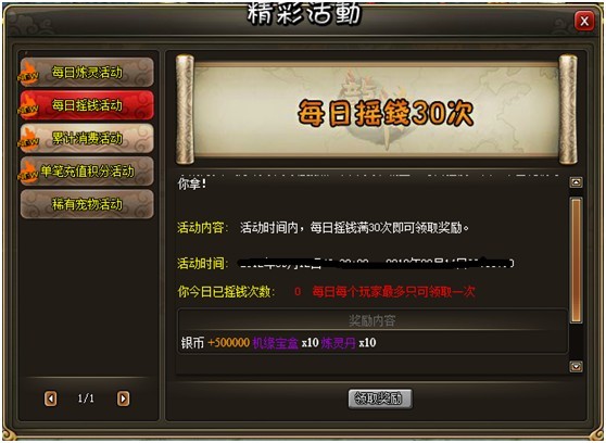 活动内容:活动时间内,每日摇钱满30次即可领取奖励。