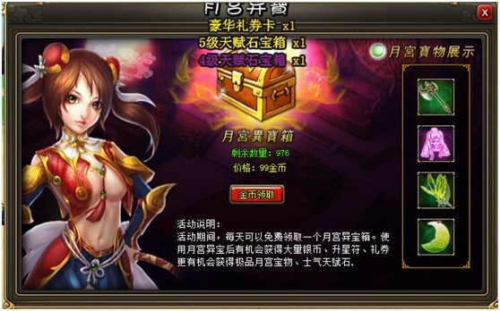 活动期间,每天可以免费领取一个月宫异宝箱,使用月宫异宝有机会获得大量银币、升星符、礼券,更有机会获得极品月宫宝物、士气天赋石!