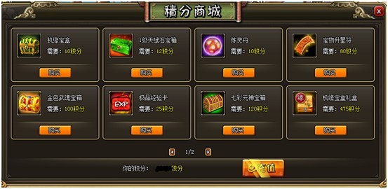 活动内容:活动时间内,玩家使用金币进行宝物升星和兽灵修炼可获得消耗金币35%的积分返还(返还的积分向下取整),使用积分在游戏界面消费积分商城兑换极品道具!