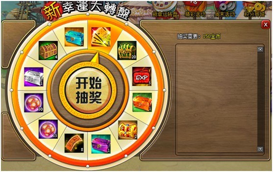 活动内容:活动当天玩家可点击游戏中的“新幸运转盘”活动按钮,在打开的活动界面中参与活动,72级以下玩家每次可花费90金币转动转盘,赢取相应的奖励;72级以上玩家每次可花费150金币转动转盘,赢取更高价值的奖励。