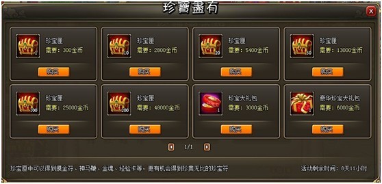 活动内容:活动时间内玩家可以使用金币在活动界面购买珍宝匣,使用珍宝匣以后有几率获得机缘宝盒、金魂、经验卡、珍宝符、银币等!活动时间仅有3天,错过机会不再,赶快行动起来,江山美人尽如怀中!