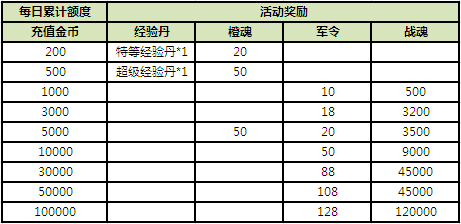 活动二:每日充值送经验丹、橙魂、军令、战魂
