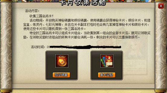 活动内容:活动期间,开放购买神秘锦囊和缤纷锦囊,使用锦囊会获得神秘卡片、缤纷卡片、机缘宝盒、炼灵丹、七彩元神等,并且在关卡副本打怪时也会有几率掉落神秘卡片和缤纷卡片。使用这些卡片可以随机得到一张三国名将卡。