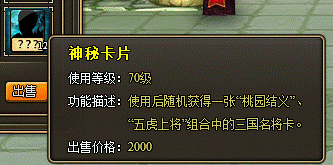 特殊说明:使用神秘锦囊或者缤纷锦囊,分别可以获得“神秘卡片”和“缤纷卡片”。使用神秘卡片后可随机获得一张“桃园结义”、“五虎上将”组合中的三国名将卡。