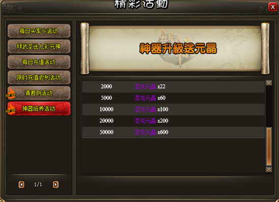 活动内容:活动时间内,每日金币锻造神器消费满指定额度即可获得相应的混沌元晶奖励!
