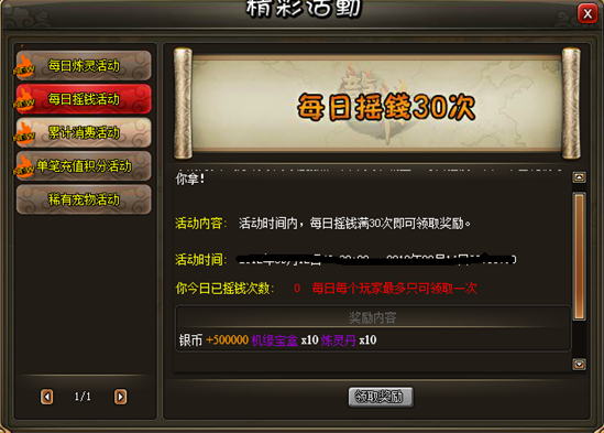 活动内容:活动时间内,每日摇钱满30次即可领取奖励。