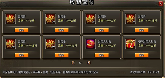 活动内容:活动时间内玩家可以使用金币在活动界面购买珍宝匣,使用珍宝匣以后有几率获得机缘宝盒、金魂、经验卡、珍宝符、银币等!活动时间仅有3天,错过机会不再,赶快行动起来,江山美人尽如怀中!