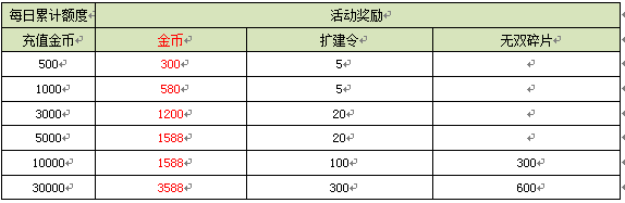 每日充值送金币、扩建令、无双碎片!