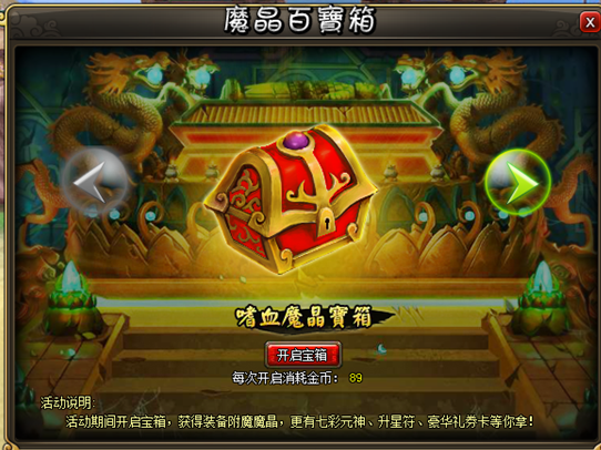 1. 活动期间开启宝箱,获得装备附魔魔晶,更有七彩元神、升星符、豪华礼券卡等你拿!