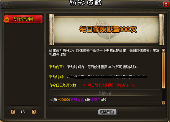 活动内容:活动时间内,每日修炼兽灵100次即可领取奖励