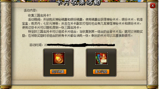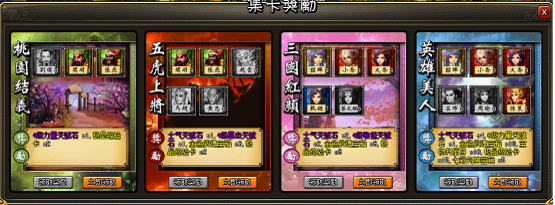 特殊说明:使用神秘锦囊或者缤纷锦囊,分别可以获得“神秘卡片”和“缤纷卡片”。使用神秘卡片后可随机获得一张“桃园结义”、“五虎上将”组合中的三国名将卡。