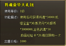 将魂豪华大礼包:使用后可获得将魂*50000,机缘宝盒*50,炼灵丹*50,银币*3000000,金色武魂*50,极品经验卡*20。