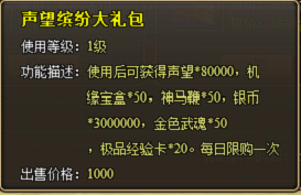 声望缤纷大礼包:使用后可获得声望*80000,机缘宝盒*50,炼灵丹*50,银币*3000000,金色武魂*50,极品经验卡*20。