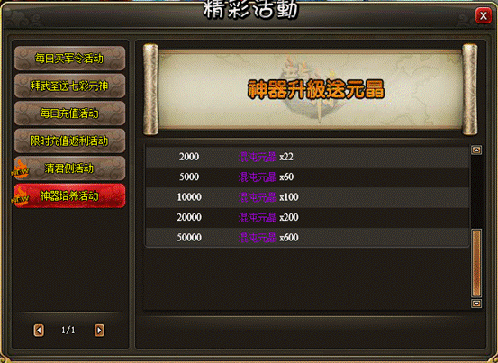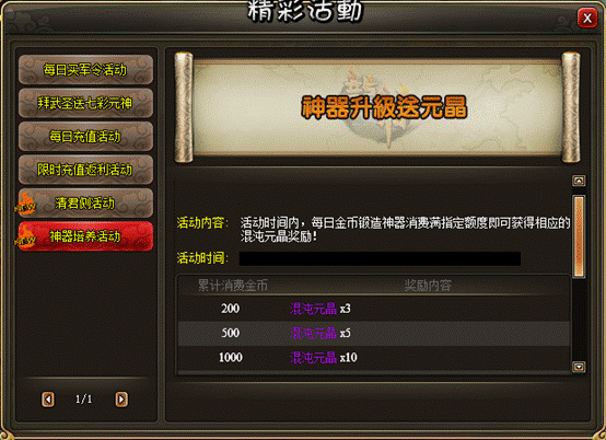 活动内容:活动时间内,每日金币锻造神器消费满指定额度即可获得相应的混沌元晶奖励!