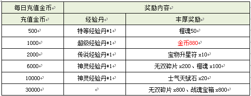 活动内容:活动时间内,每日充值满相应阶梯的金币即可领取丰富奖励一份。