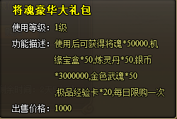 将魂豪华大礼包:使用后可获得将魂*50000,机缘宝盒*50,炼灵丹*50,银币*3000000,金色武魂*50,极品经验卡*20。