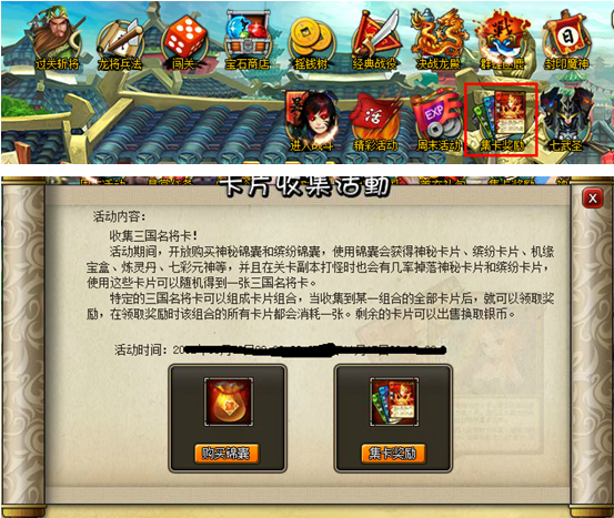 活动内容:活动期间,开放购买神秘锦囊和缤纷锦囊,使用锦囊会获得神秘卡片、缤纷卡片、机缘宝盒、炼灵丹、七彩元神等,并且在关卡副本打怪时也会有几率掉落神秘卡片和缤纷卡片。使用这些卡片可以随机得到一张三国名将卡。