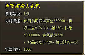 声望缤纷大礼包:使用后可获得声望*80000,机缘宝盒*50,炼灵丹*50,银币*3000000,金色武魂*50,极品经验卡*20。