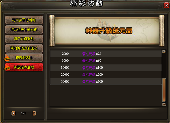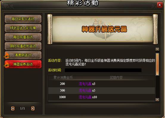 活动内容:活动时间内,每日金币锻造神器消费满指定额度即可获得相应的混沌元晶奖励!