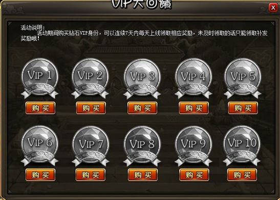 2. 只能使用金币购买的VIP钻石卡向下兼容,也就是高等级VIP可以购买低级VIP钻石卡,并且可以同时购买不同等级的VIP钻石卡。