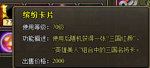 特殊说明:使用缤纷卡片后可随机获得一张“三国红颜”、“英雄美人”组合中的三国名将卡。