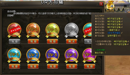 4. 每天的VIP奖励,在活动界面领取。如果当天的奖励没有上线领取,则在第二天只能领取漏补发离线奖励。不同等级钻石卡离线奖励不同。