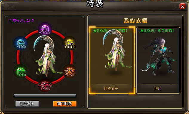 l 有时限的绚丽时装形象可在中秋满月面板购买(仅可购买一次),初始等级为0,在时装面板可对时装进行选择穿戴和强化操作,花费少量金币即可使时装升级,每次升级都将提升对主角属性的加成效果并重置时装的有效时间限制,强化达到5级之后时装将会永久存在并生效。