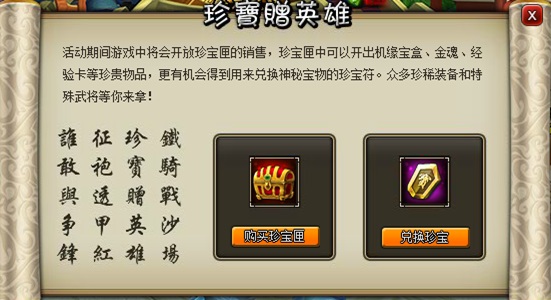活动内容:活动时间内玩家可以使用金币在活动界面购买珍宝匣,使用珍宝匣以后有几率获得机缘宝盒、金魂、经验卡、珍宝符、银币等!活动时间仅有x天,错过机会不再,赶快行动起来,江山美人尽如怀中!