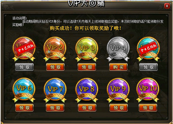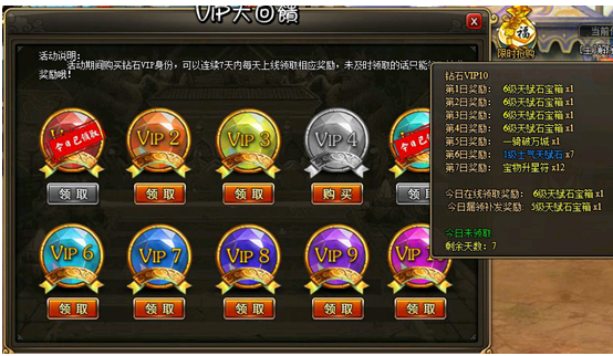 4. 每天的VIP奖励,在活动界面领取。如果当天的奖励没有上线领取,则在第二天只能领取漏补发离线奖励。不同等级钻石卡离线奖励不同。
