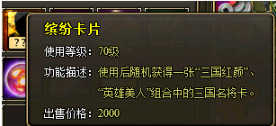 特殊说明:使用缤纷卡片后可随机获得一张“三国红颜”、“英雄美人”组合中的三国名将卡。