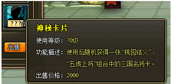 特殊说明:使用神秘锦囊或者缤纷锦囊,分别可以获得“神秘卡片”和“缤纷卡片”。使用神秘卡片后可随机获得一张“桃园结义”、“五虎上将”组合中的三国名将卡。