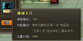 特殊说明:使用神秘锦囊或者缤纷锦囊,分别可以获得“神秘卡片”和“缤纷卡片”。使用神秘卡片后可随机获得一张“桃园结义”、“五虎上将”组合中的三国名将卡。