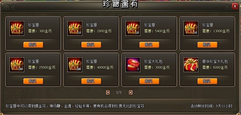 活动内容:活动时间内玩家可以使用金币在活动界面购买珍宝匣,使用珍宝匣以后有几率获得机缘宝盒、金魂、经验卡、珍宝符、银币等!活动时间仅有x天,错过机会不再,赶快行动起来,江山美人尽如怀中!