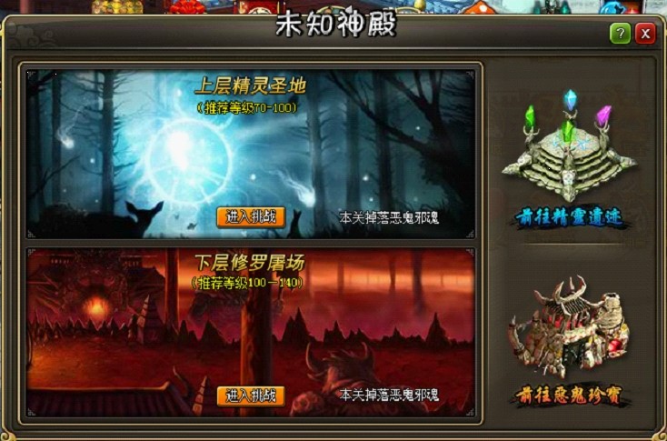 活动开启期间,玩家可选择挑战未知神殿上层精灵区域或下层恶鬼区域,每日只可选择进入一个区域进行挑战