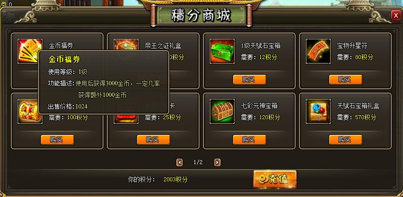 注:积分商城活动开启后,金币福券,11阶宝物,装备。不管活动开启几次,每个角色只能兑换一次