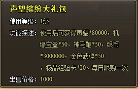 声望缤纷大礼包:使用后可获得声望*80000,机缘宝盒*50,炼灵丹*50,银币*3000000,金色武魂*50,极品经验卡*20。