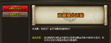 活动内容:活动时间内,玩家可在游戏内任意系统消耗金币都即可获得消费金币数35%的消费积分返还,(例如活动期间消费了1000金币,消费积分活动即返回350消费积分)。消费积分可在消费积分商城中购买稀有道具。