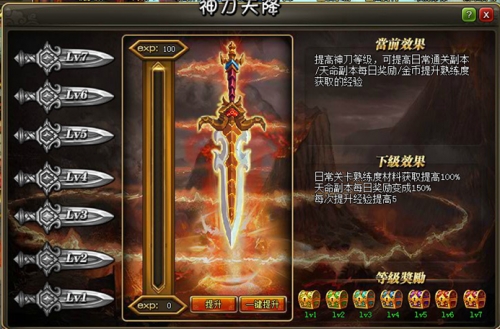 2.神刀可升级,神刀等级越高,获取武将熟练度的效率也越高